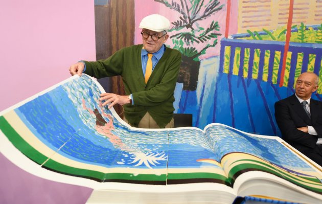 Nicht weniger spektakulär: Der Taschen-Stand zur Monografie „A bigger book“ über US-Künstler David Hockney, vorgestellt auf der Buchmesse 2016. Der Messestand feierte den Maler auf gigantischen Bilderwänden, Hockney kam selbst nach Frankfurt und wurde mit seinen iPad-Gemälden zum Star der Messe.