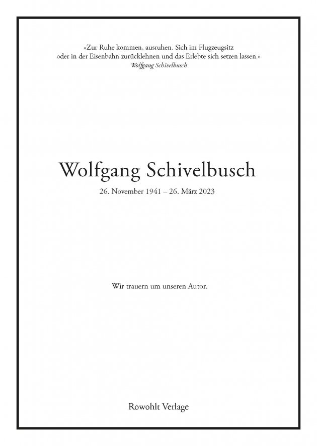 Bei Rowohlt erschien zuletzt der Erinnerungsband "Die andere Seite. Leben und Forschen zwischen New York und Berlin" (2021). Schivelbusch erzählt darin von seinem Leben zwischen Alter und Neuer Welt und von einem Denken, das nicht zuletzt aus dem damit verbundenen Perspektivwechsel seine Spannung und Kraft bezog.