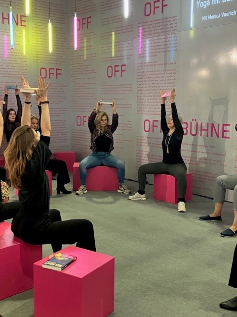 Mit Pro Helvetia und Lehrerin Monica Vuerich kann man jeden Messetag mit Yoga beginnen. Statt Block gibt es natürlich ein Buch. Das klappt erstaunlich gut: Einmal kurz lockern, stärken, Kraft tanken - und lachen, wenn einer Yogini aus der Gruppe das Buch vom Rücken fällt.