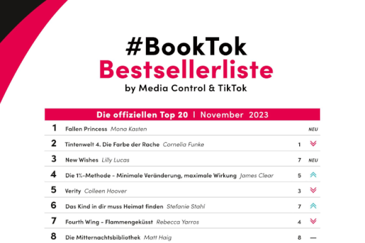 Mona Kasten setzt sich mit "Fallen Princess" sofort auf Platz 1 der offiziellen #BookTok-Bestsellerliste von TikTok und Media Control für den November. Damit schiebt sie Cornelia Funke, Spitzenreiterin im vorigen Monat, auf den zweiten Rang. Insgesamt schaffen es fünf Titel neu in die Liste. Darunter einer von 2013.