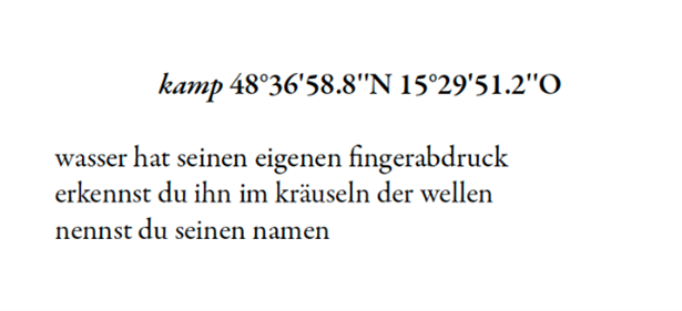 In ihrem Gedichtband „azur ton nähe – flussdiktate“ (Limbus Verlag 2022) würdigt Schletterer die Pluralität von Gewässern, also neben großen Flüssen auch so manche Rinnsale, Bäche, Seen und Kanäle. „Ich denke, wir schreiben so oft an Wasserorten und werden davon auch inspiriert, aber wir geben ihnen zu wenig zurück. Es war mir ein Anliegen, die Gewässer zu Co-Autor:innen zu machen und ihnen eine Stimme zu geben. Deswegen hat jedes Gedicht den Namen des Gewässers und die genauen Koordinaten, wo diese Begegnung stattfand, als Titel.“